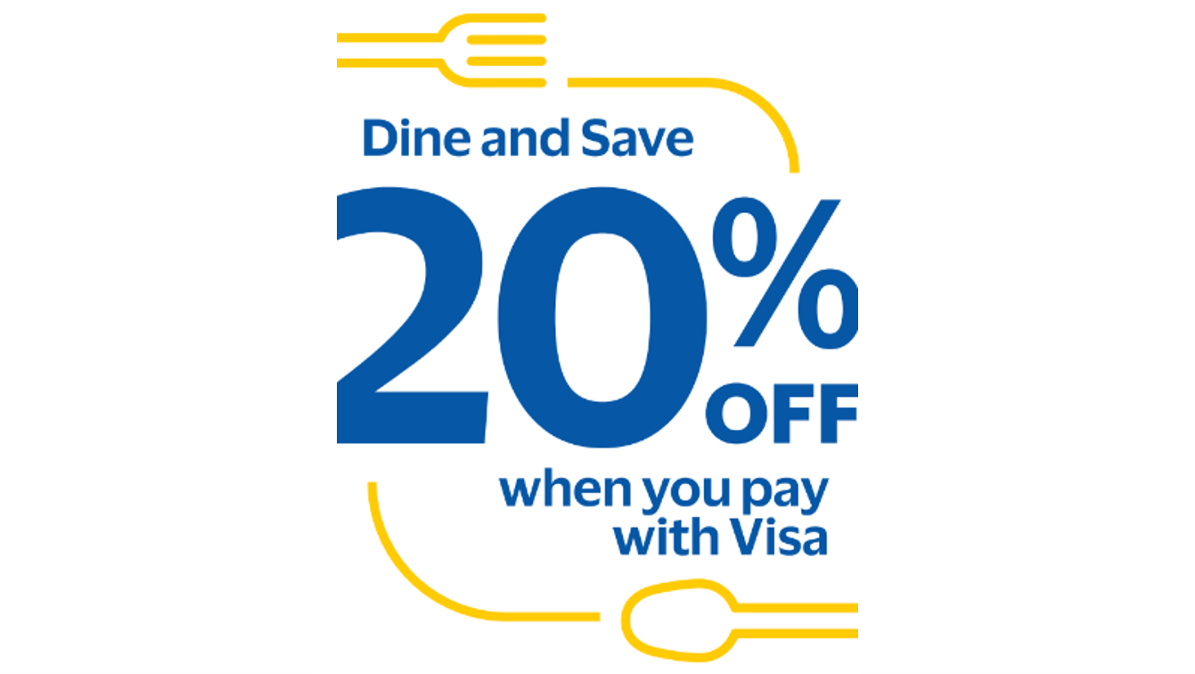 Dine and Save with Visa. Enjoy up to 20% off your bill at participating restaurants.